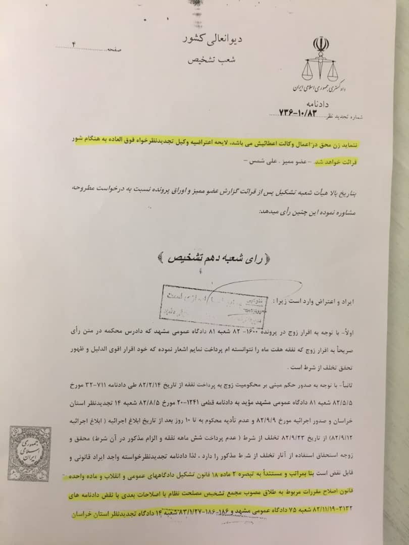 پرونده ای در سال ۱۳۸۲ داشتم که مربوط به درخواست طلاق به علت تحقق شرط اول ضمن عقد بود. موکل م شرط "حق وكالت در طلاق زوجه در صورت عدم پرداخت شش ماه نفقه توسط زوج" را به عنوان شرط اول ضمن عقد داشتند. زوج هفت ماه نفقه را پرداخت نکرده بود. در دادگاه طلاق به زوج برای پرداخت نفقه سه روز فرصت داده شد که زوج طی سه روز نفقه را پرداخت کرد و قاضی محترم به عدم تحقق شرط رای دادند، با پیگیری انجام شده و با استدلال اینجانب در شعب تشخیص دیوان عالی کشور، که شرط تحقق یافته و پرداخت نفقه تاثیری ندارد، رای دادگاه به نفعه زوجه داده شد. در اين پرونده به استناد شرط ضمن عقد مذکور، حكم به نفع زوجه با تمام حقوق قانوني صادر شد.