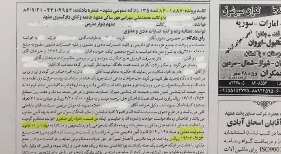 اعاده حيثيت از موكل و درج عذرخواهي در روزنامه خراسان