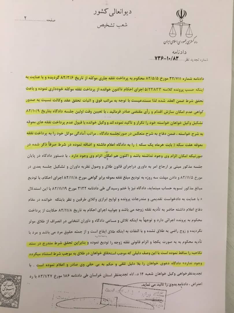 در اين پرونده به استناد اين شرط حكم به نفع زوجه با تمام حقوق قانوني صادر شد البته وصول مهريه مستقل بايد اقدام شود و اين حق براي تقسيط آن براي زوج وجود دارد كه در جاي خود صحبت خواهد شد.